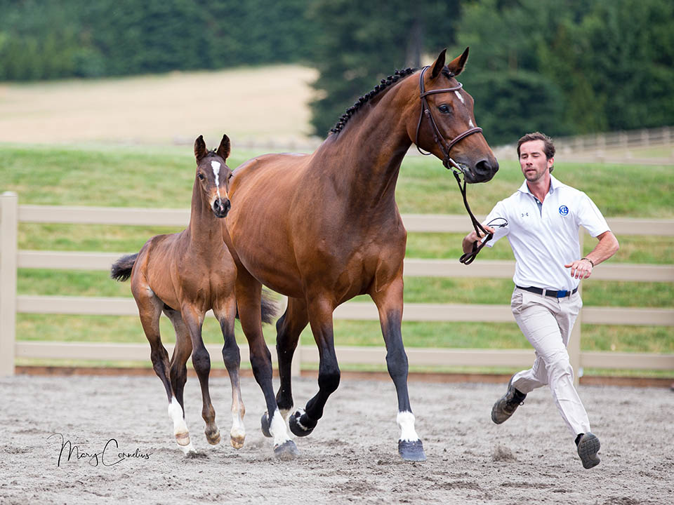 Sire Chaccothage Blue PS (Chacco Blue x Conthargos) won his stallion performance test in Adelheidsdorf, receiving a perfect 10 for his willingness to perform. His first foals have been highly sought after and have garnered very good prices at the auctions. Chianti’s Chacco brought 28,500 euros at the Schockemohle Jumping Foal Auction. Diamantina van’t Ruytershof (full sister of Emerald) has also produced two fillies by Chaccothage Blue which illustrates the expectations of him as a breeding stallion.